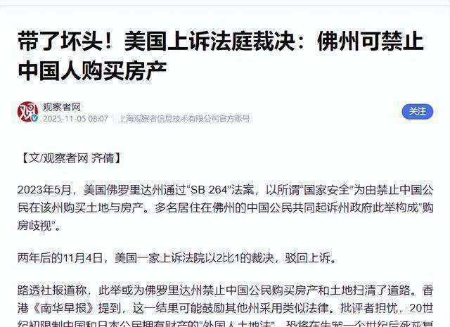 联邦上诉法院的南希·阿布杜正在同意看法中明白指出:“佛州的法案是对非美国出格是中国居平易近实施全面,然而现实完全坐不住脚。联邦上诉法院曾对两名正正在采办房产的中国发布姑且,